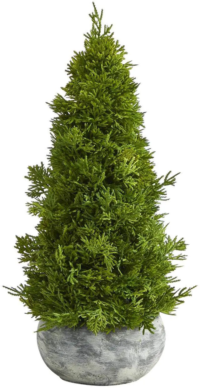 Add hints of seasonal evergreens into your holiday decor scheme with the help of this artificial tree, intricately designed from an overgrowth of wild, cypress greenery in a cone-like shape to evoke a Christmas tree-like appearance. Requiring absolutely no upkeep or maintenance, this handsome fake tree standing 18ö high from a decorative planter.