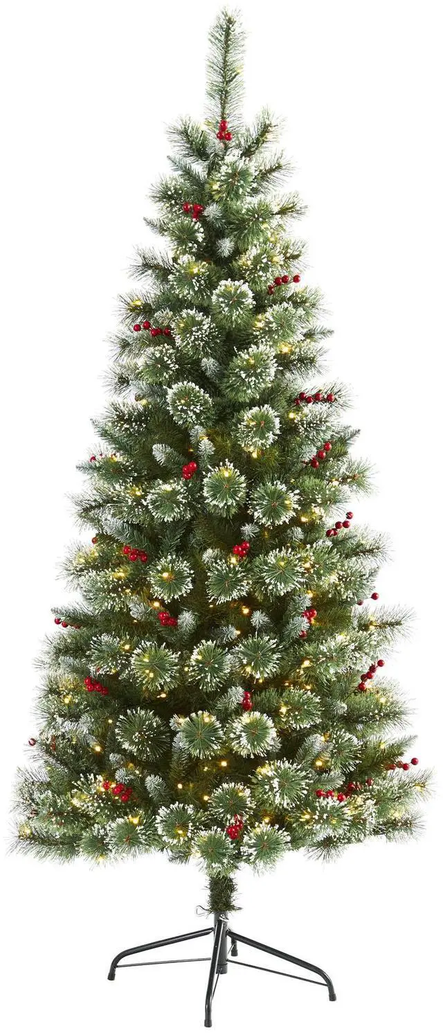 Create a true winter-scape in your home or office with the help of this flocked artificial Christmas tree; entirely maintenance-free, this realistic looking fake tree boasts a rich collection of pine foliage (365 tips to accent with your holiday ornaments! ), handsomely accented throughout with bright, red berries that look incredibly lifelike and finished with a frosted, snow-like quality to evoke a true winter wonderland. Arriving pre-strung with 300 lights to eliminate tangles and settled on a metal stand, this 6' tall Christmas tree will not only make holiday decorating a breeze but ensure your home is always holiday-dressed for years to come.