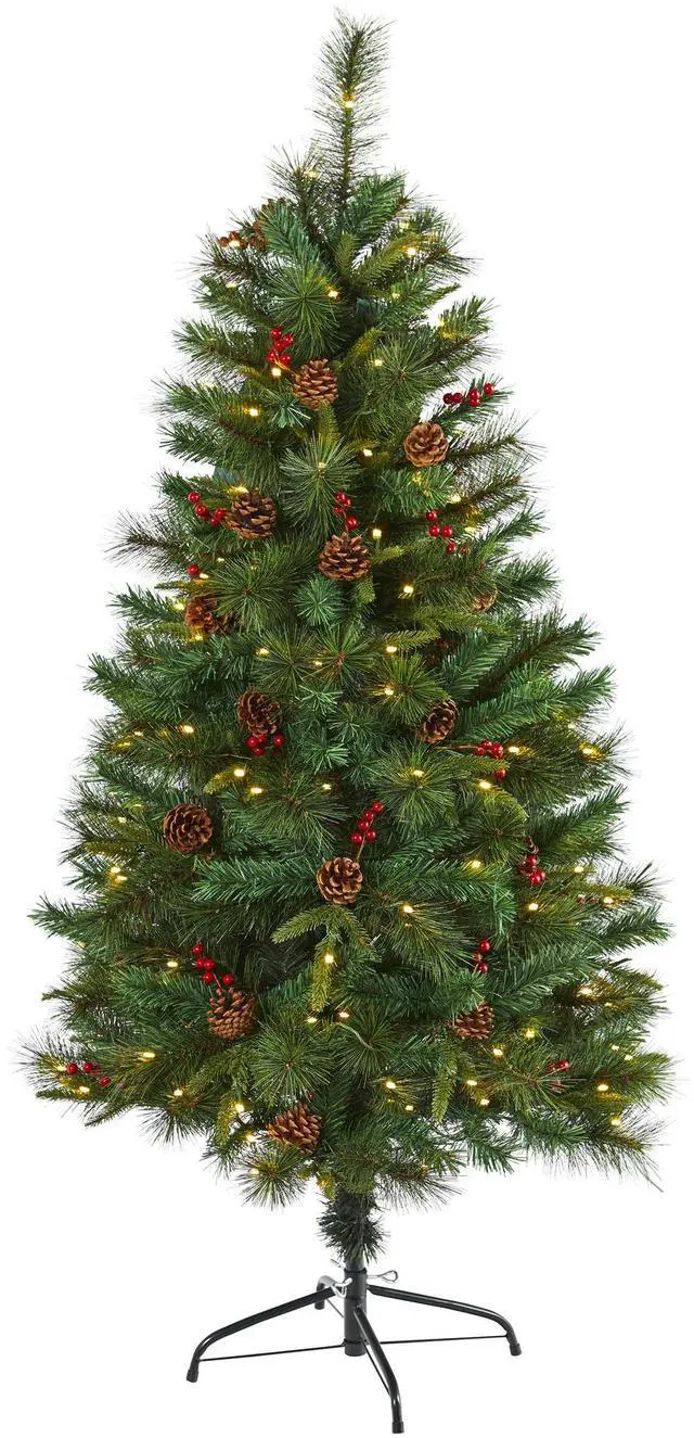 Create the ultimate holiday scene in your home or office with the help of this evergreen artificial Christmas tree; entirely maintenance-free, this realistic looking fake tree boasts a rich collection of pine foliage (162 tips to accent with your holiday ornaments! ), handsomely accented throughout with faux pinecones and bright, red berries that look incredibly lifelike. Arriving pre-strung with 150 LED lights to eliminate tangles and stabilized on a metal stand, this 5' tall Christmas tree will not only make holiday decorating a breeze but ensure your home is always holiday-dressed for years to come.
