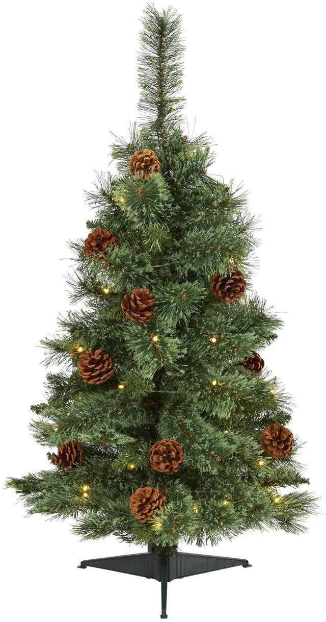 Create the ultimate holiday scene in your home or office with the help of this evergreen artificial Christmas tree; entirely maintenance-free, this realistic looking Christmas tree boasts a rich collection of pine foliage made up of 83 easy-to-bend branches to hang all of your favorite holiday ornaments and accented throughout with faux pinecones that look incredibly lifelike. Arriving pre-strung with 50 clear LED lights (battery operated) to eliminate tangles and stabilized on a metal stand, this versatile 3' tall Christmas tree will not only make holiday decorating a breeze but ensure your home is always holiday-dressed for years to come.