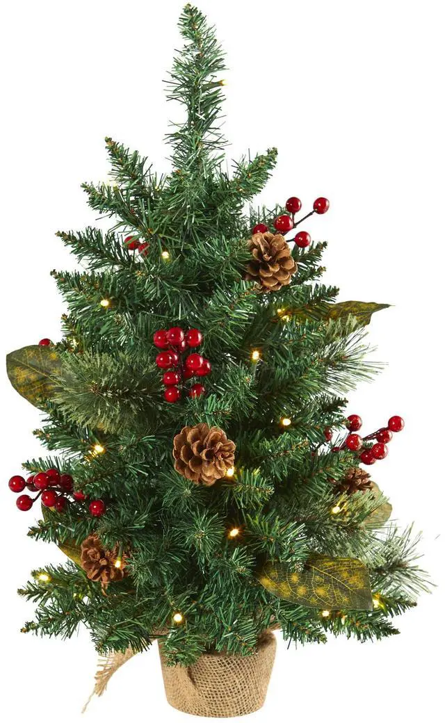 Create the ultimate holiday scene in even the smallest spaces with the help of this holiday-inspired artificial Christmas tree; entirely maintenance-free, this realistic looking fake tree boasts a rich collection of pine foliage (80 tips to accent with your holiday ornaments! ), handsomely accented throughout with miniature faux pinecones and bright, red berries that look incredibly lifelike. Arriving pre-strung with 35 LED lights to eliminate tangles, this 2' tall Christmas tree will not only create a holiday statement wherever displayed but can easily be re-used and re-decorated for years to come.