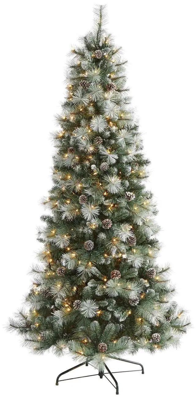 Create your own winter wonderland this holiday season with the help of this frosted tip British Columbia Mountain pine artificial Christmas tree. Easy and stress-free, this artificial Christmas tree boasts a robust silhouette of mountain pine foliage made up of countless easy-to-bend branches, perfect for showcasing all your favorite holiday ornaments, accented throughout with pinecones, and finished with frosted tips to create hints of a winter setting. Arriving pre-strung with 400 clear lights to eliminate tangles and carefully stabilized on a metal stand, this handsome 7' tall frosted artificial Christmas tree will not only make decorating a breeze but ensure your home remains picture perfect all season long.