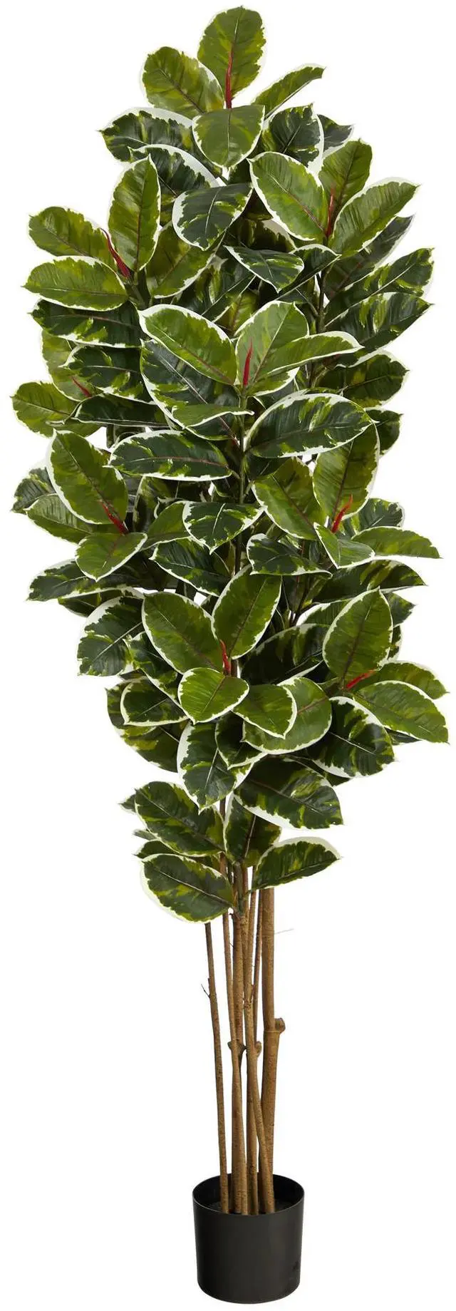 The impressive Oak Artificial Tree will make a grand entrance in any home. Large, glossy, variegated leaves with naturally occurring red detail in the center stem from thin trunks for a medley of green foliage. This fake tree is UV resistant, and you can place it outdoor safely. Standing 6' from a nursery planter, DIY and pair with your favorite pot. For a jungle look, put it in your backyard, foyer, or entryway.