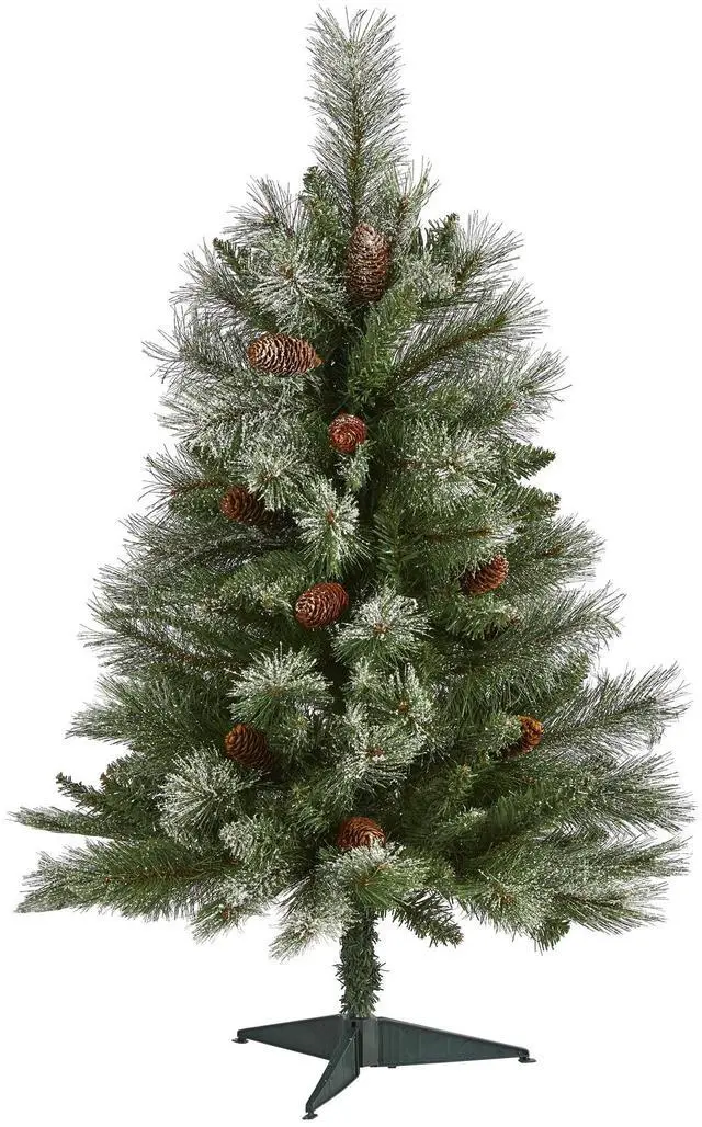 Evoke hints of a winter wonderland this holiday season with the help of this snowy artificial Christmas tree! Completely maintenance-free, this winter-inspired fake Christmas tree boasts a robust silhouette of snow-dusted foliage made up of easy-to-bend branch tips for decorating with your own holiday ornaments, accented throughout with faux pinecones that look incredibly lifelike. Carefully stabilized on a metal stand, this versatile 3' tall snowy artificial Christmas tree will not only make holiday decorating a breeze but ensure your home is always holiday-dressed for years to come.