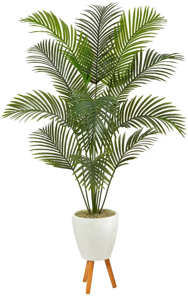 Summer is always here with this Golden Cane Artificial Palm Tree. Different shades of palm fronds contrast each other and create green foliage that adds visual interest and symmetry. The trunk has natural, intricate detailing like the multi-hued variegation that is found in the real ones. Standing 6.5 ' from a white tripod planter, curate in tight spaces that need some summer love. Perfect for bathrooms, living rooms, apartments, and awkward corners.?