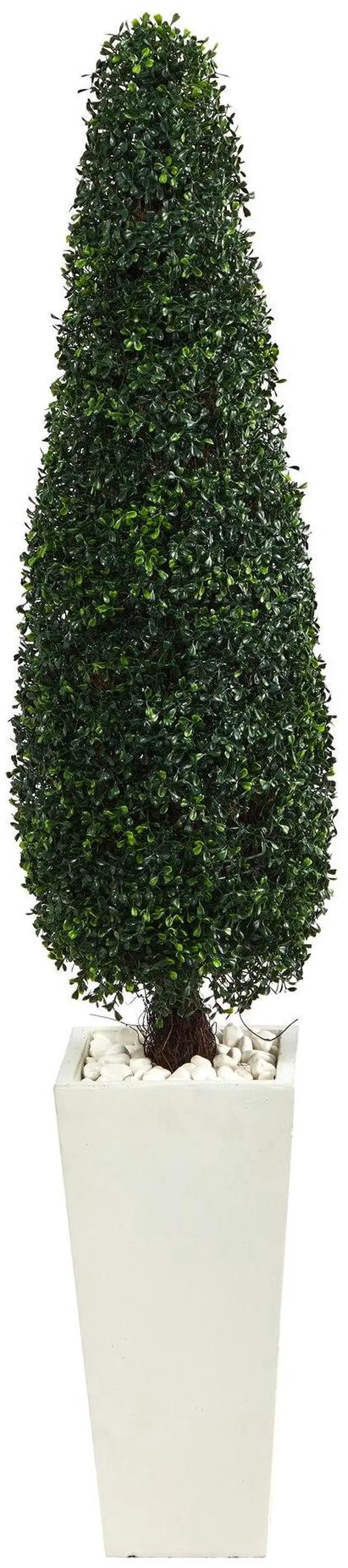Escape to an elegant European summer villa with this perfectly trimmed Boxwood Topiary Artificial Tree û that requires zero maintenance. Always make a great first impression with a medley of lush, glossy leaves manicured in a rectangular shape. Enhance your curb appeal by placing this faux Boxwood Topiary Tree in your back yard, front yard, garden or patio and be transported to an enchanting oasis. Standing at 63", from a tall white planter (included in height), curate with other topiaries for a cohesive look. We carry boxwood topiaries in larger and smaller sizes.