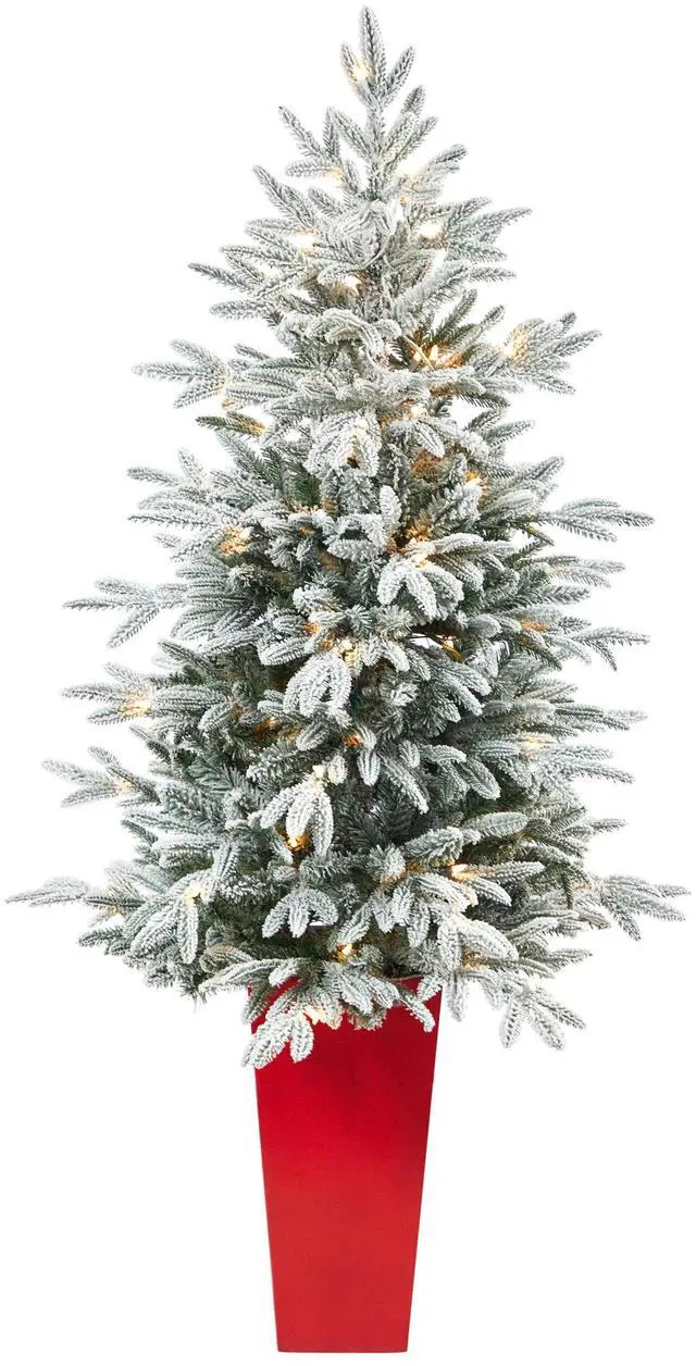 If you're dreaming of a white Christmas, look no further, this flocked Manchester Spruce Artificial Christmas Tree makes your wish come true. Designed to mimic real evergreen foliage and texture, this mini artificial Christmas tree features 357 easy-to-bend branches û allowing you to decorate with your mini ornaments. Pre-strung, with 100 lights, for a cozy feel - save time and money. Standing at 5' from a red tower planter (height includes planter), make a Xmas statement, wherever you curate. Its compact size makes it perfect for kids' rooms, foyers, apartments, and dorms.