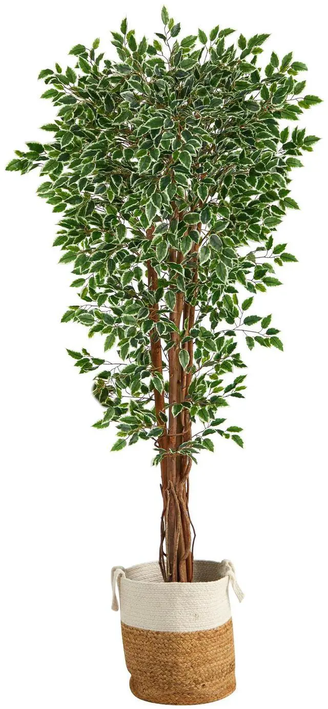 Make an elegant statement in your living areas with this Ficus Artificial Tree. A symphony of variegated Ficus leaves ranging from light to dark green stem from thin, easy to bend branches, creating a full look. The twisting trunks are incredibly lifelike because they're made from natural trunk. Stands 70" from a jute planter (included in height) and is UV resistant, making it safe for outdoor use. Perfect for foyers, backyards, awkward corners, and bathrooms. Complements many dTcor styles.