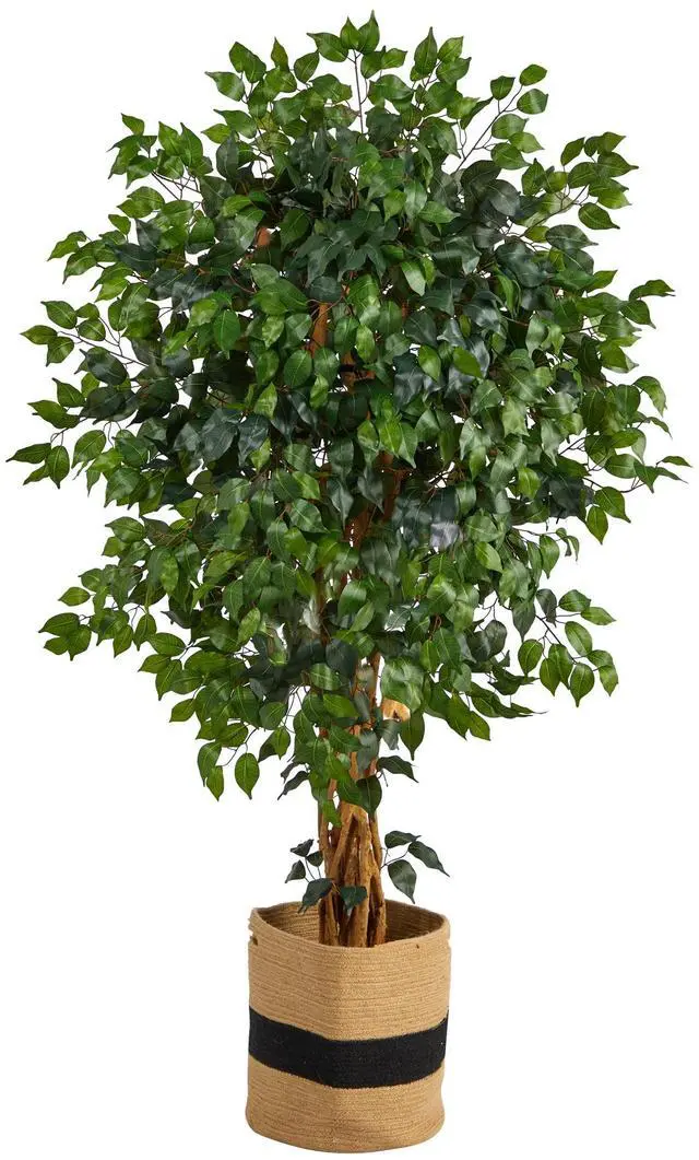 Delicate yet airy, soften any space with this Palace Ficus Artificial Tree. Inspired by nature, this faux tree has petite leaves set on a natural trunk, bringing texture wherever displayed. Assembled from high-quality materials, inject some greenery into your living areas by bending the 1344 branches to fit in your space. Standing 5.5 ' from a natural planter (included in height), curate in any compact room. Perfect for a living room, bedroom or corner.