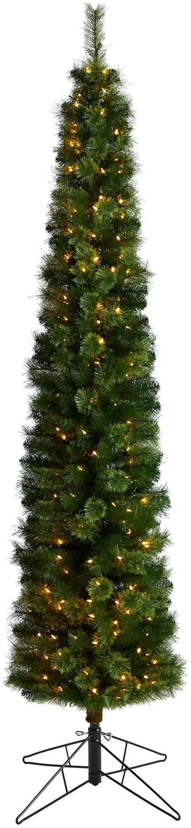 Create a traditional Christmas scene in a tall tight space with the help of this pencil slim artificial Christmas tree! Perfect for the smallest, tightest spaces because of its narrow, pencil-like design, it boasts spaced tiers of evergreen foliage made up of 402 easy-to-bend branch tips for showcasing all your favorite holiday ornaments. Pre-strung with 200 clear LED lights, it also features 8 different light options (including Twinkle, Bursts, and Fade) to create a true holiday glow wherever displayed. Carefully stabilized on a metal stand, this impressive, space-saving 8' tall artificial Christmas tree will make decorating a breeze for years to come.