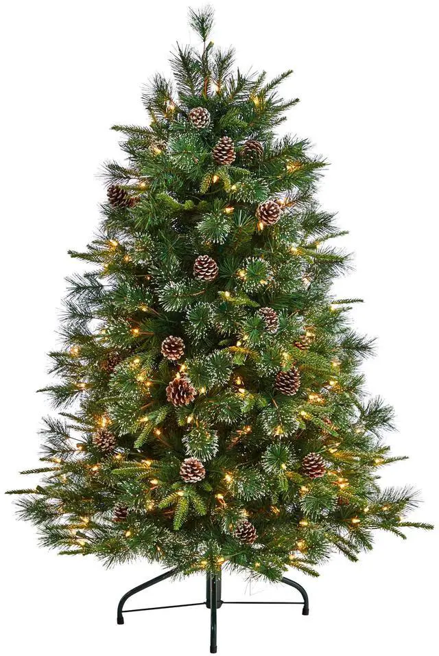 Recreate a snowy Christmas with this Snow Tipped Artificial Christmas Tree. Arriving pre-strung with 250 clear lights and accented with pinecones throughout for a natural, rustic look, house this faux Christmas tree in any narrow area. Designed to mimic a Christmas wonderland, bend the 858 PVC branches to fit in your space and adorn them with your favorite mini ornaments. Standing 5', have a bright Christmas, no matter the size of your area. Perfect for a kids' room, narrow area, apartment or dorm room