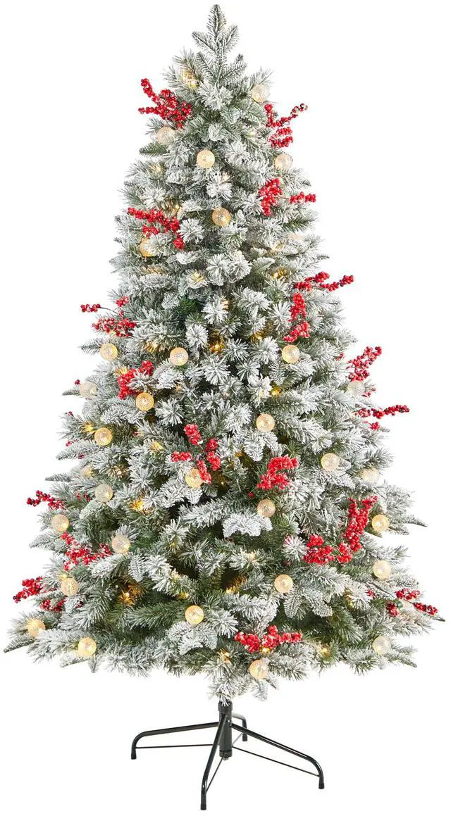 Have a berry merry Christmas with the help of this frosted Artificial Christmas Tree. Inspired by nature, this robust silhouette mimics the real natural foliage and texture found in their European counterparts with snow in the 906 easy-to-bend branches. Arriving pre-strung with 200 LED lights for a warm, candle-like glow û and 50 globe lights for a stunning illumination, this cute artificial Christmas tree also comes dressed from top to bottom with faux berries. Standing 6' from a metal stand, this tree spreads Christmas cheer while adding some color. All that's missing is your decorations.
