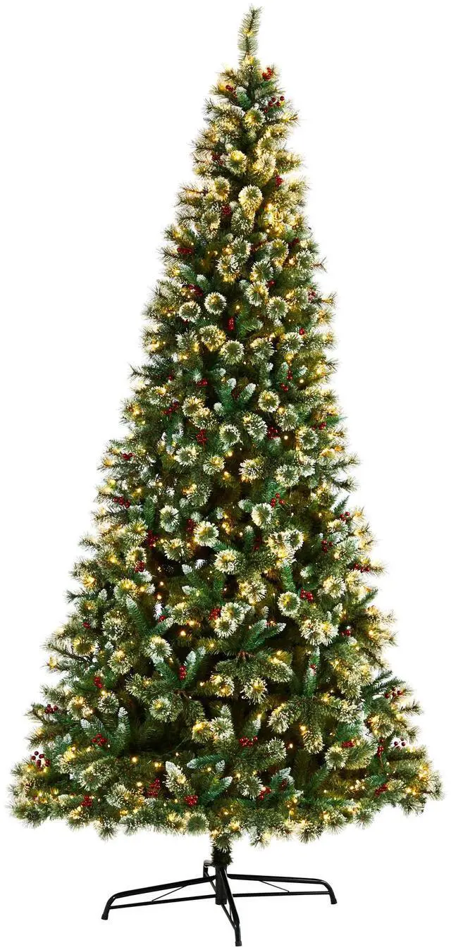 Have a berry merry Christmas with the help of this frosted Swiss Pine Artificial Christmas Tree. Inspired by nature, this robust silhouette mimics the real natural foliage and texture found in their counterparts with snow in the easy-to-bend branches. Arriving pre-strung with 850 clear LED lights for a warm, candle-like glow û this artificial Christmas tree also comes dressed from top to bottom with faux berries. Standing 10' from a metal stand (included in height) this tree requires zero maintenance. All that's missing are your decorations. Perfect for spaces that need some holiday cheer.