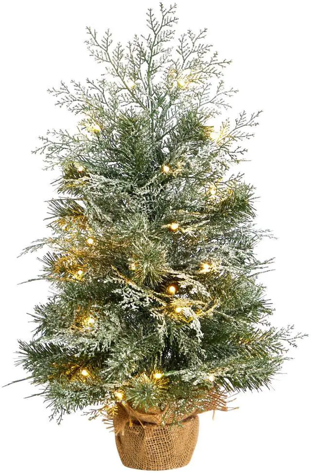 Spread Christmas cheer to compact spaces with this Artificial Christmas Tree. Inspired by nature and crafted from high-quality materials, this mini Christmas tree has lifelike bendable branches, allowing you to shape in your space, and add mini ornaments. To save you time and money, the faux tree comes with 35 LED lights for a cozy glow, allowing you to illuminate any space for years to come. Standing 2' from a burlap base (included in height) for a rustic touch, add to any desktop. Perfect for a kids' room, office or mantel.