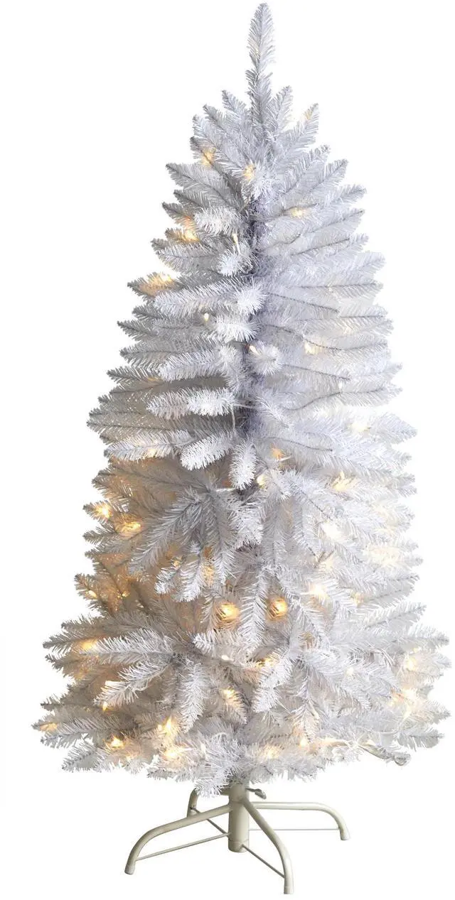 Are you dreaming of a white Christmas? Fulfill all your dreams with this white artificial Christmas tree. Inspired by nature, this tree has a slim silhouette that mimics its real counterparts' natural foliage and texture. With 293 bendable branches, you can easily display all your favorite ornaments. Save time and money with the pre-strung 100 lights. Standing 4' from a metal stand, curate in any compact area. Perfect for an apartment, kids' room, or home office.