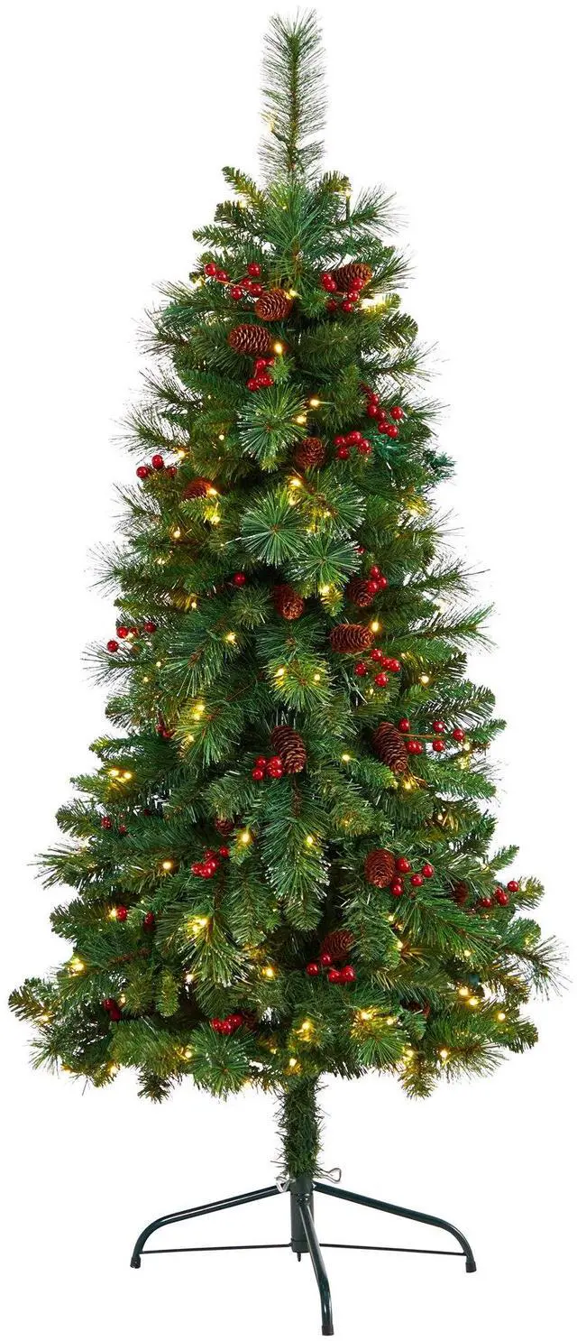 Lack room for a full tree? Also known as the 1/2 artificial Christmas tree, this space-saving tree is perfect for any tight area. Just place against the wall and watch as this unique silhouette sits just as a full tree would - all while occupying less space and ornaments. The lush, green foliage is accented by pinecones and berries and arrives pre-strung with 110 warm white LED lights that use less energy. Standing 5' house in any narrow area. Perhaps in a narrow corner, living room or hallway that needs more holiday cheer.