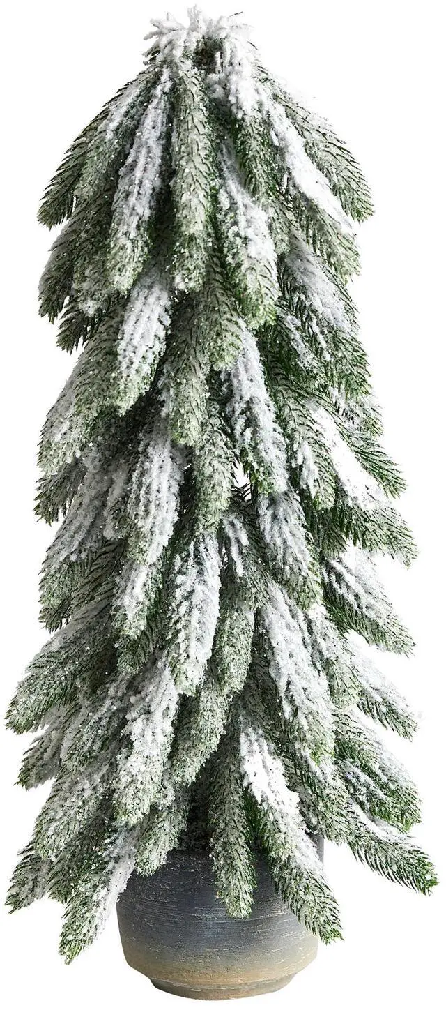 Spread Christmas cheer to your tabletops with this desktop artificial Christmas tree. Recreate a snowy winter wonderland with the snow dusting on the thick branches. Hang all your favorite Christmas ornaments quickly and effortlessly, and you can even illuminate with your favorite lights. Standing 21ö from a decorative planter, add to any desktop. Perfect for a kids' room, office or mantel.