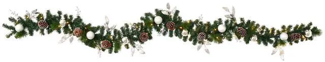 Complete your holiday decor scheme with this artificial winter garland, intricately designed from realistic looking pine foliage in a palette of seasonal evergreens and accented throughout with faux pinecones that look incredibly lifelike and decorative ornaments - all to help evoke the Christmas spirit. Arriving pre-strung with 50 clear LED lights (battery operated) to eliminate tangles, it will effortlessly illuminate any space it inhabits. Great for showcasing over a mantle, bare counter, or stair banister, this impressive 9' long artificial garland will undoubtedly complete a traditional holiday setting for years to come.