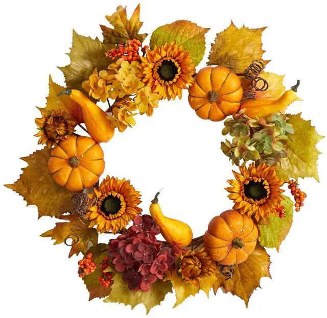 Get ready for the fall season with this Autumn Sunflower, Hydrangea and Pumpkin Artificial Wreath. Inspired by nature, lifelike hydrangeas are nestled in between sunflowers, berries and pumpkins. Full of texture and striking color, transform your space into a fall, cozy dream. Handcrafted from fine materials, display for years to come. With a diameter of 22" hang in any area during the autumn season.
