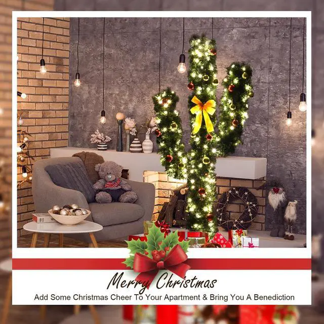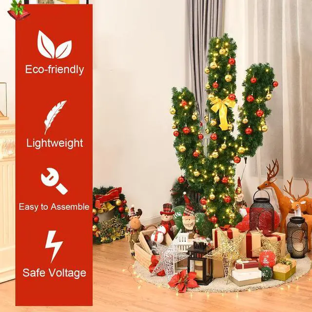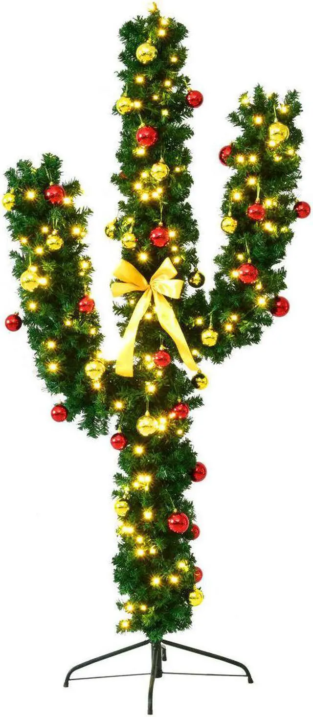 Our new 5Ft Pre-Lit PVC Artificial Cactus Christmas tree is an ideal Christmas trimmings. The cactus is made of fade and crush resistant PVC needles, appears fresh-cut. The pre-installed 90 LED lights provide a warm white lighting effects, adding a fantastic festive atmosphere to your home. High density iron bases to keep the tree planted in an upright position. The cactus also comes with ball Ornaments, which you need to decorate by yourself. Our cactus has great quality, making it your best choice. Do not hesitate to buy it!