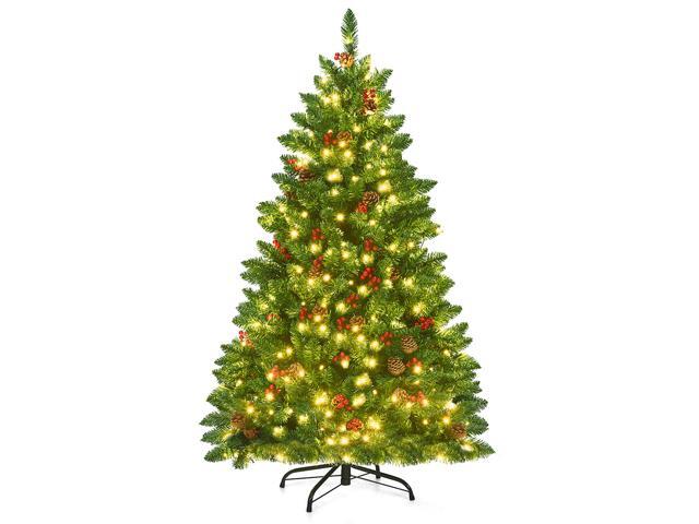 This tree is tall, leafy and fluffy with 516 branch tips, which will be a great decoration at Christmas. 300 LED lights, 32 groups of pine cones and red berries add a warm festival atmosphere, making the tree more gorgeous and attractive. PVC branches are environment-friendly and fire resistant for long-time use. Iron stand makes the tree stable without tilting. Besides, the branches are connected to the trunk by hinges to set up effortlessly in a short time. It is suitable for home and business use.