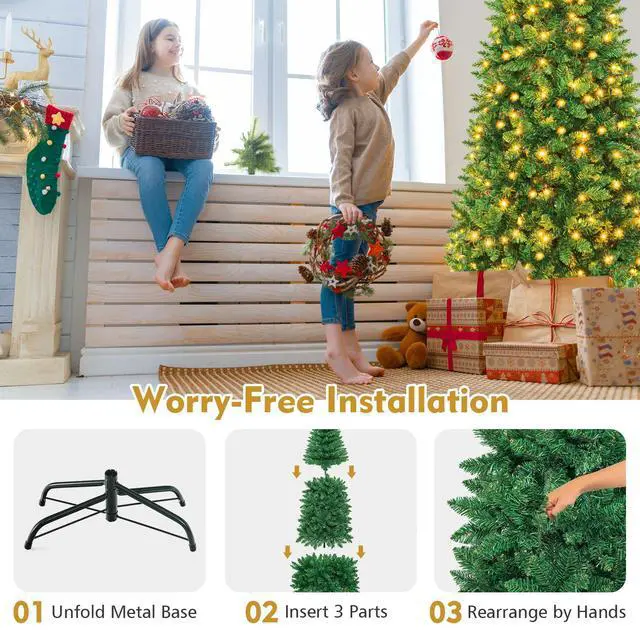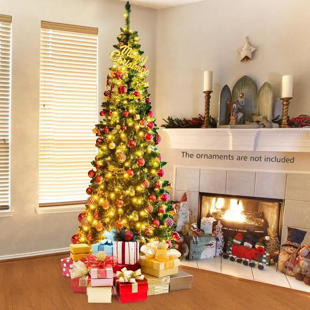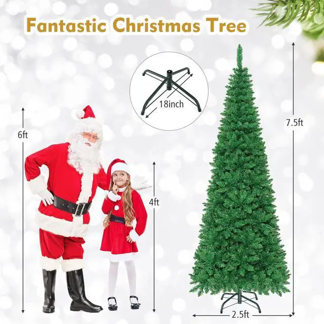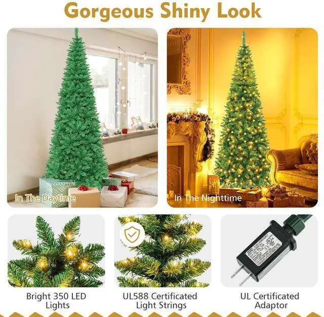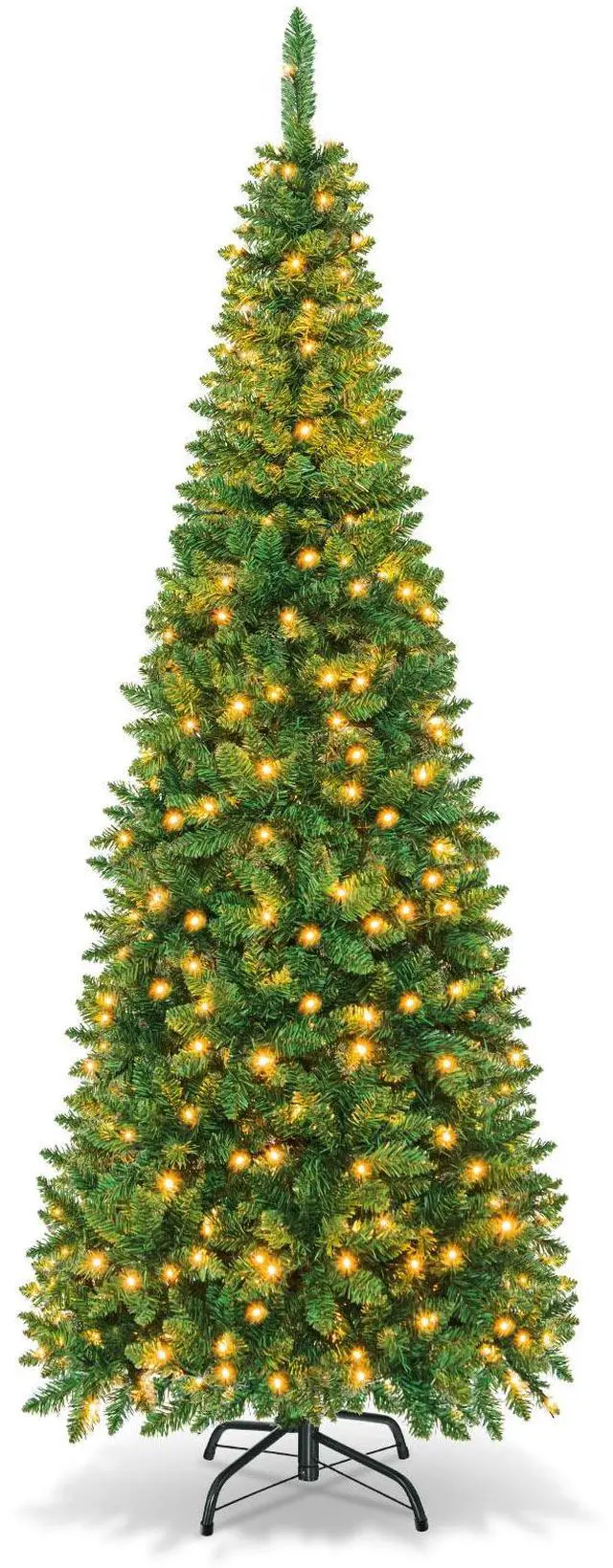 This is our 7.5 ft pre-lit pencil Christmas tree which is designed with 1085 branch tips to offer a realistic and lush appearance. Pre-installed with 350 warm white LED lights, the slim tree saves you the hassle of hanging up the lights and help light up your room. It is effortless to make the tree fluff due to its hinged construction, while also facilitating its assemble and storage. Foldable X-shaped iron stand with foot pads prevents breakage and enhances the balance of the tree, offering stability to keep the wondrous tree standing all year around. Whether for your home, courtyard, or for commercial places like shops, hotels, the slim Christmas pencil tree is the perfect eye-catching decoration to add multiple fun and festive holiday fullness!