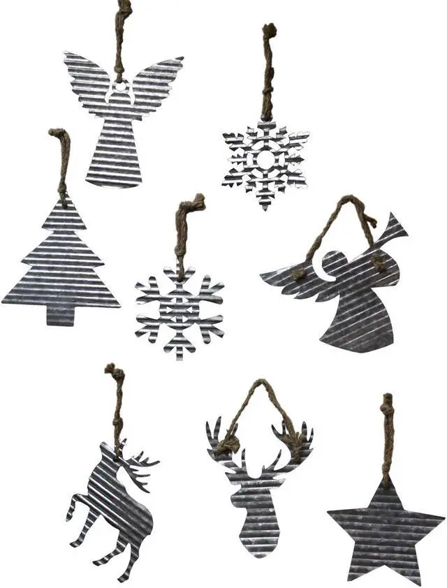 This set of eight ornaments showcase several different holiday designs. Each design adds holiday cheer to your Christmas tree. Your tree will be brimming with holiday delight when decorated with these metal ornaments. Hang these ornaments on the fireplace mantle, in your dining room, etc. to get in the holiday spirit.. Largest measures approximately 8 x 7 x 3 inches. Smallest measures approximately 6 x 6 1/2 inches. Made of laser cut corrugated metal with jute hanger, imported. Set of 8 includes two snowflakes, one star, one tree, one reindeer, one reindeer head and two angels.