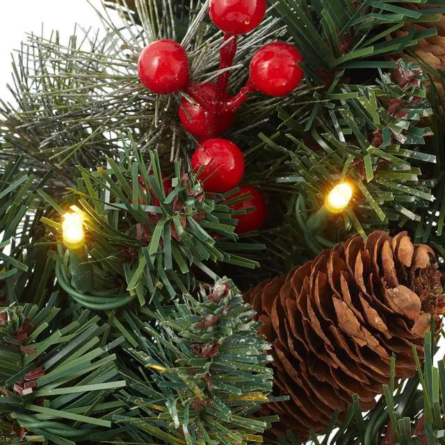 The branches and needles are both flame retardant and non-allergenic. This lush and full Christmas wreath sets up easily. For its most lush and full form, please set aside 15 minutes to properly shape the wreath. Simply pull down and arrange the branches to your preference with the included protective gloves. Dimensions 24 Diameter. 108 Tips. 50 LED lights. Requires 3AA batteries (not included).