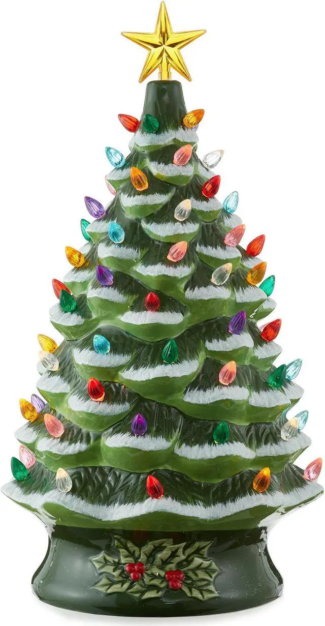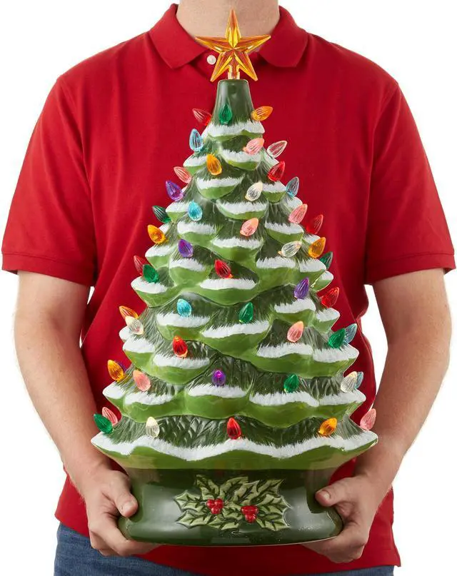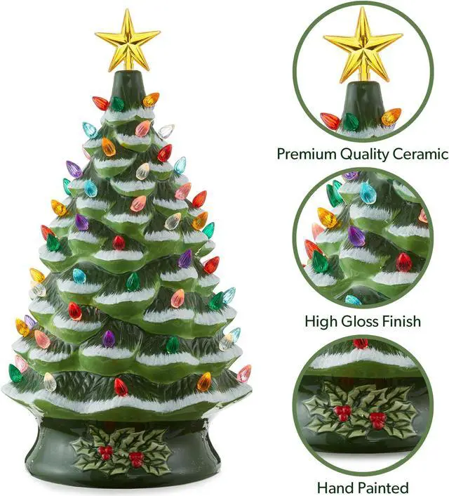 The Casafield ceramic Christmas tree comes with two complete sets of bulbs and toppers giving you two options to decorate as you choose. You can personalize the look of your tree easily, as each bulb sits in a replaceable plastic fitting that keeps it in place. Bulb fittings are provided in two sizes to accommodate slight variations in the hole size. Beautifully hand-painted and crafted from glazed ceramic, this tree features a smooth, high-gloss finish to complement all your best seasonal decorations. The 8 Ft. power cord will keep your tree brightly lit with no need to worry about replacing batteries.