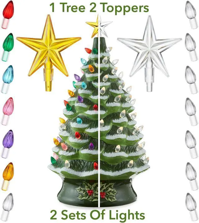 Set includes: One ceramic tree, 148 bulbs (74 clear bulbs, 74 multi-colored bulbs), two 7-pointed star toppers, 1 gold and 1 clear with plastic fittings, and 148 plastic bulb fittings. Bulb fittings are provided in two sizes to accommodate slight variations in the hole sizes.
