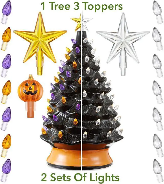 Set includes: One Halloween tree, 148 bulbs (74 purple and orange bulbs, 74 clear bulbs), one Jack-O-Lantern topper and fitting, two 7-pointed star toppers, 1 gold and 1 clear with plastic fittings, and 148 plastic bulb fittings. Bulb fittings are provided in two sizes to accommodate slight variations in the hole sizes.