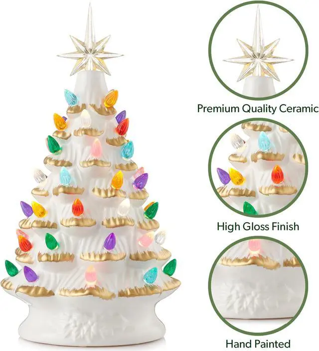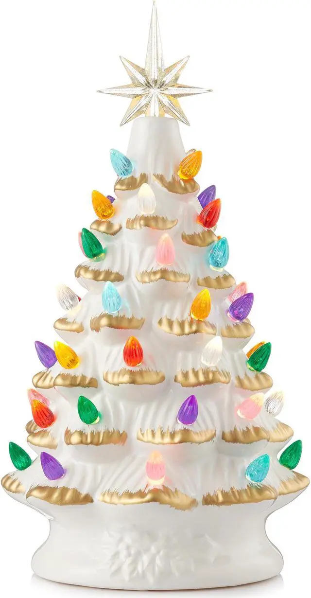Casafield Hand Painted Ceramic Christmas Tree, White 12-Inch Pre-Lit Tree with 100 Multi Color Lights and 2 Star Toppers