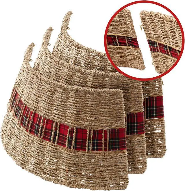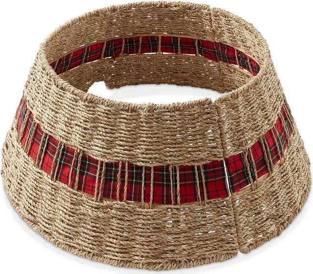 Enhance your holiday decor with Casafield's Christmas tree collar, adding a rustic elegance to your festive display. The collar, featuring a braided pattern, tartan plaid ribbon and tapered design, is woven from sustainable, natural water hyacinth, ensuring both durability and environmental friendliness. Supported by a sturdy metal frame, these collars are designed to last. This stylish alternative to traditional tree skirts covers both the tree stand and lower trunk, safeguarding young children and pets from the base of the tree. A prefabricated opening allows for tidy cord management, keeping your holiday display looking pristine.