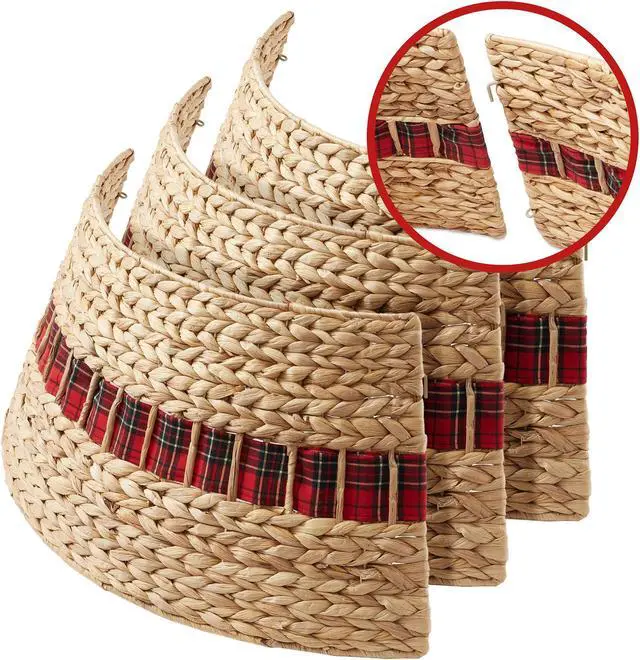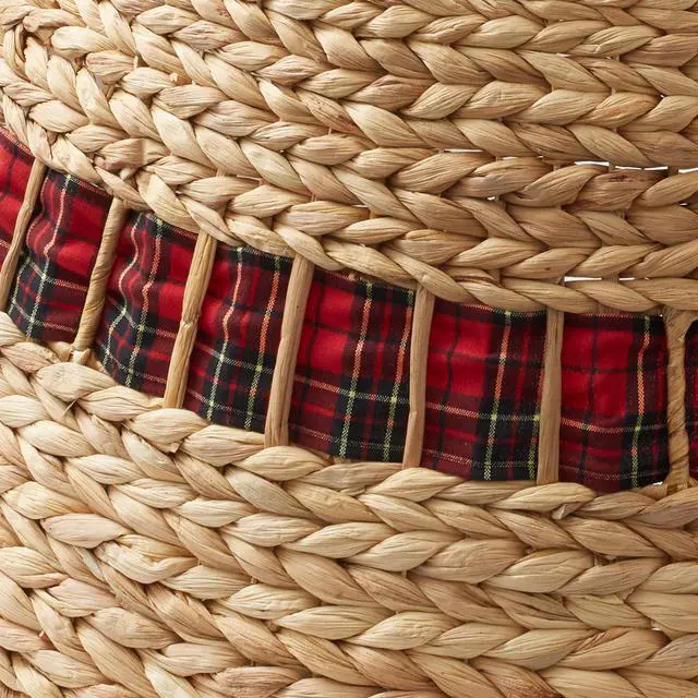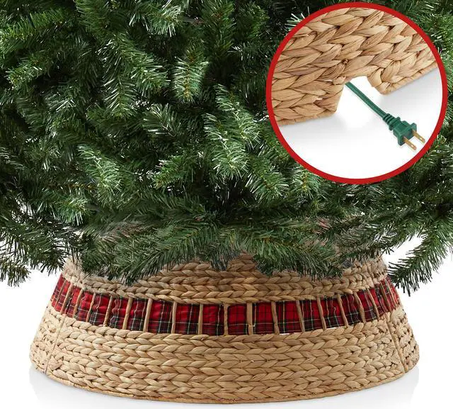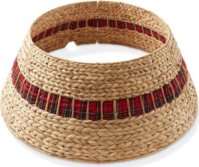Enhance your holiday decor with Casafield's Christmas tree collar, adding a rustic elegance to your festive display. The collar, featuring a braided pattern, tartan plaid ribbon and tapered design, is woven from sustainable, natural water hyacinth, ensuring both durability and environmental friendliness. Supported by a sturdy metal frame, these collars are designed to last. This stylish alternative to traditional tree skirts covers both the tree stand and lower trunk, safeguarding young children and pets from the base of the tree. A prefabricated opening allows for tidy cord management, keeping your holiday display looking pristine.