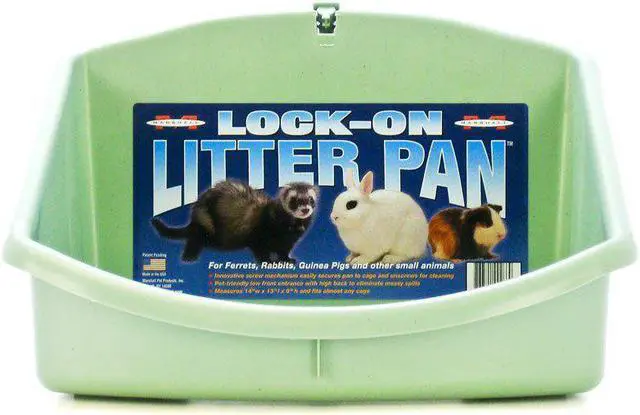 Marshall Ferret Lock-On Litter Pan is for ferrets, rabbits, guinea pigs and other small animals. This lock on litter pan features an innovative screw mechanism that easily secures pan to cage and unscrews for cleaning. Easily secures pan to cagePet friendly low front entranceHigh back eliminate spillsThis pan features a pet-friendly low front entrance with high back to eliminate messy spills. Marshall Ferret Lock-On Litter Pan measures 14" W x 13" L x 9" H and fits almost any cage.