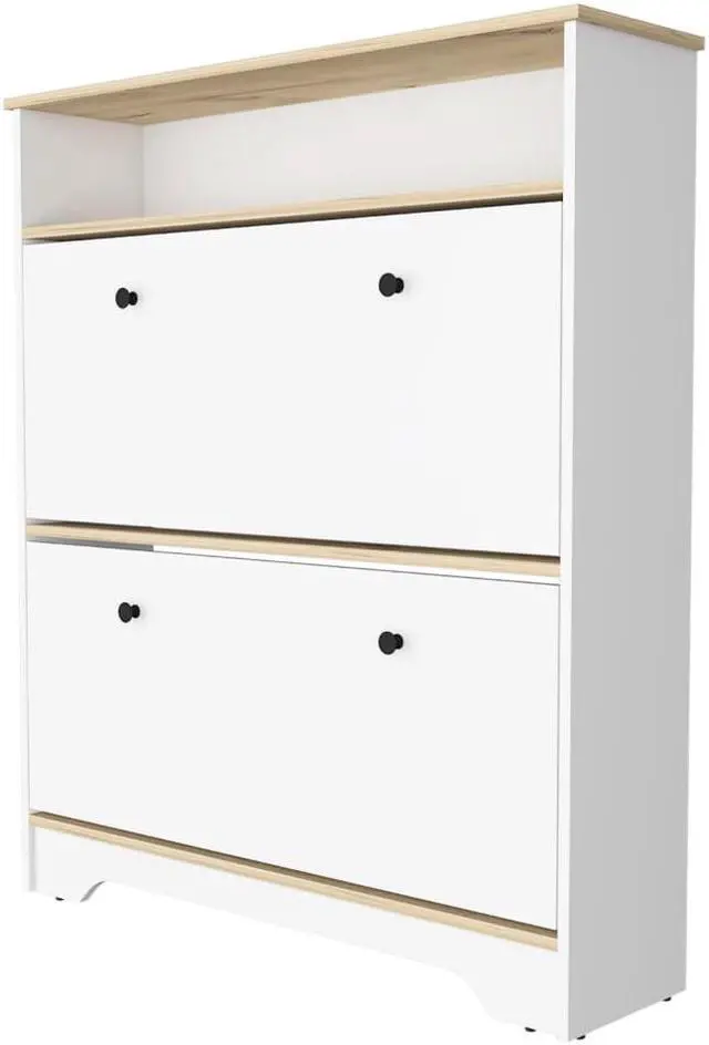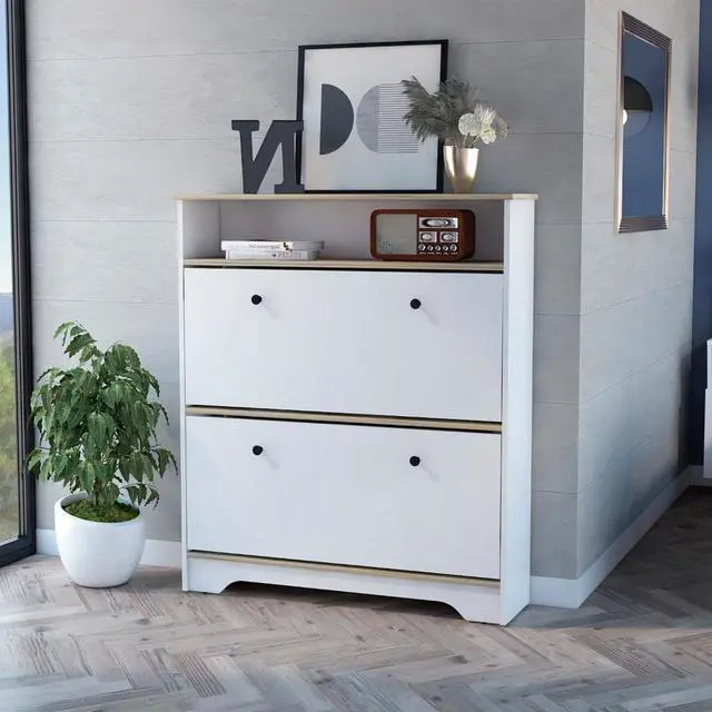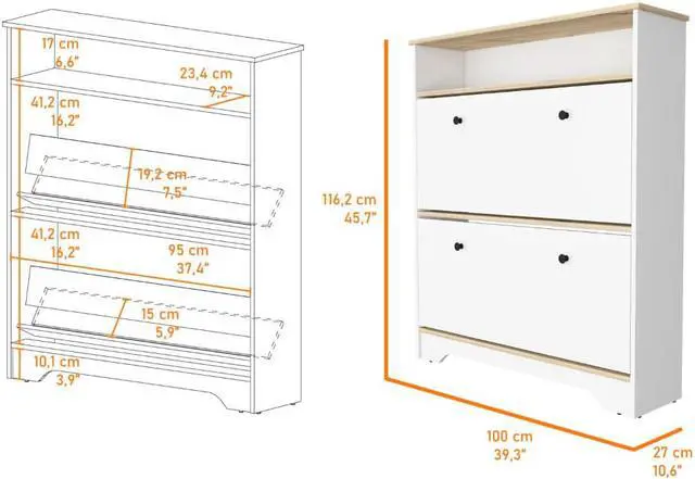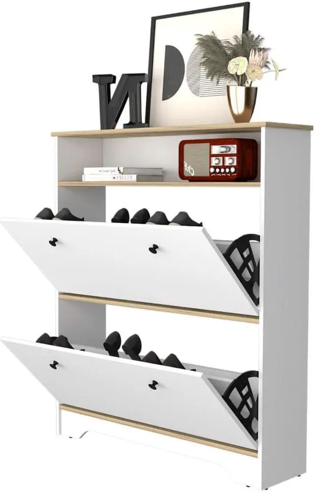 Brandford Shoe Rack, is your shoe collection taking over your room? The Brandford Shoe Rack is the perfect solution to your shoe storage woes. This innovative rack features a unique design that will take up minimal space in your room while neatly organizing all of your shoes. The rack has got you covered. With two ample shelves (37,4''W X 15,4''H) to hold up 12 pairs, one shelf (37,4''W X 6,6''H) and ample Superior Top (39,3''W X 10,6''D) Order yours today and say goodbye to cluttered closets! Designed with elegant dark Brown and light oak-white manufactured wood finish.