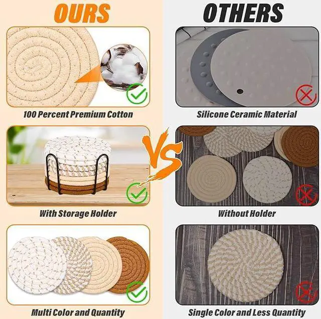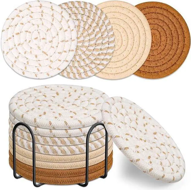 What You Get: You will get more quantity and more multiple styles coasters from us than any others . You'll get 8pcs round hand-woven cotton coasters (ultra-minimalist style, 4.3") and a 4.3"x3.1" black metal coaster holder.4 colors designs 8pcs in total, which can be used in almost any family scene.