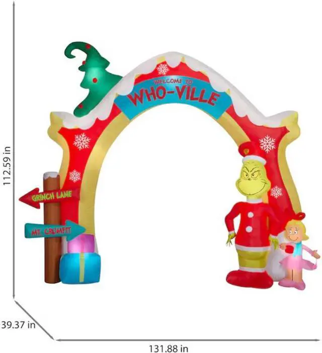 Create an eye-catching entrance or focal point with the Airblown® Inflatable Who-ville Archway! This snow-topped whimsical archway includes a curvy Christmas tree and "Welcome to Who-ville" banner at the top. The Grinch and Cindy-Lou Who standby to welcome your guests and visitors. Accented with a directional sign and colorful gift boxes, this Grinch inflatable makes a spectacular addition to indoor or outdoor Christmas decorations. Setup is a snap for the easiest decorating ever. Just plug it in, stake it down and watch the magic unfold. Includes everything needed for easy setup.