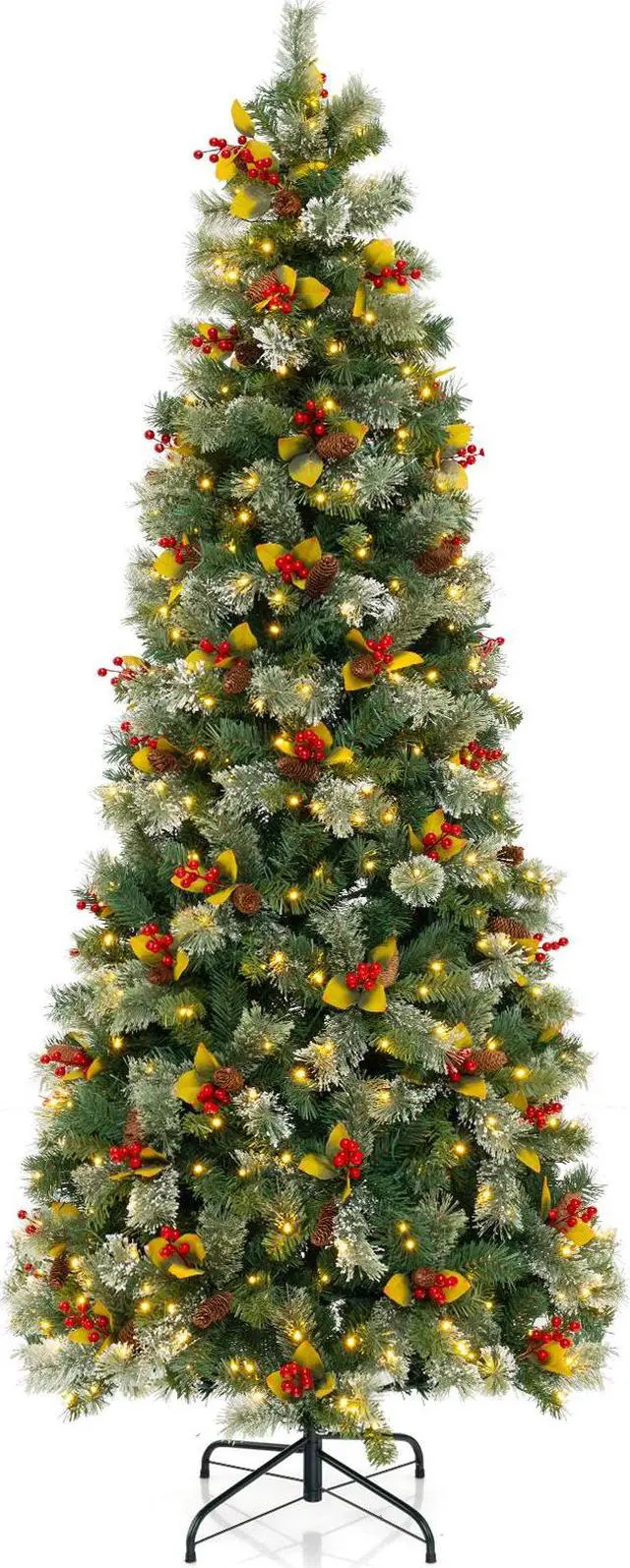 Lush and Lifelike Appearance: This 7.5ft artificial Christmas tree boasts 1096 branch tips with 4 types of leaves, including PVC leaves with different shades of green, frosted pine needles, and normal pine needles. Moreover, it is adorned with 40/76/92 clusters of red berries, natural pine cones, and artificial foliage, creating a lifelike and vibrant display.