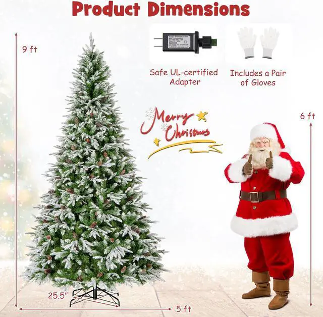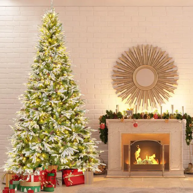 Stunning and Realistic Wintry Appearance: The artificial Christmas tree features 1871 lush branch tips, and it is designed with 3 types of leaves that are flocked PVC leaves, green PVC leaves, and snow flocked PE leaves, creating a more vivid, full-bodied, and festive appearance. Besides, the tree is elegantly embellished with 117 natural pine cones.