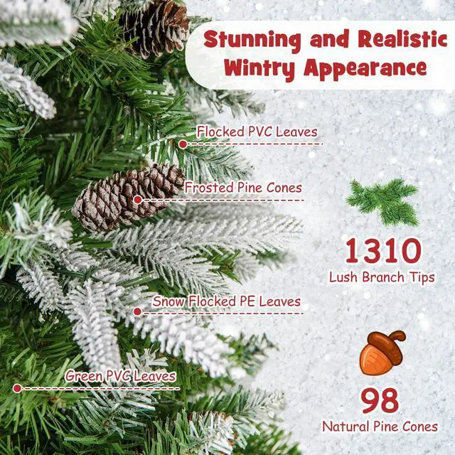 Stunning and Realistic Wintry Appearance: The artificial Christmas tree features 1310 lush branch tips, and it is designed with 3 types of leaves that are flocked PVC leaves, green PVC leaves, and snow flocked PE leaves, creating a more vivid, full-bodied, and festive appearance. Besides, the tree is elegantly embellished with 98 natural pine cones.