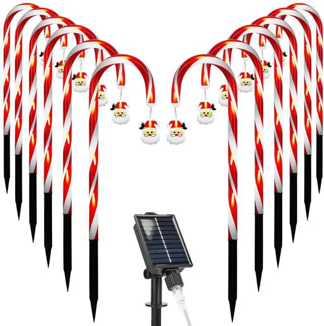 Light up your yard this holiday season with this set of 12 solar-powered Christmas candy cane lights. Featuring 72 warm LEDs and adorable Santa or snowflake accents, these festive stakes bring joy, warmth, and a magical glow to gardens, walkways, patios, and lawns. Easy to install and weather-resistant, they're perfect for outdoor use all season long.
