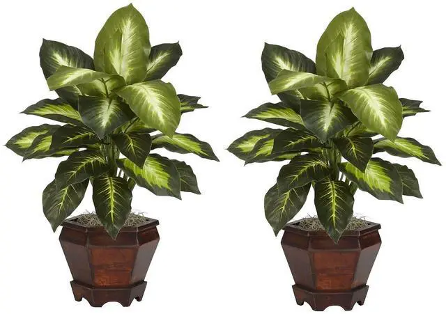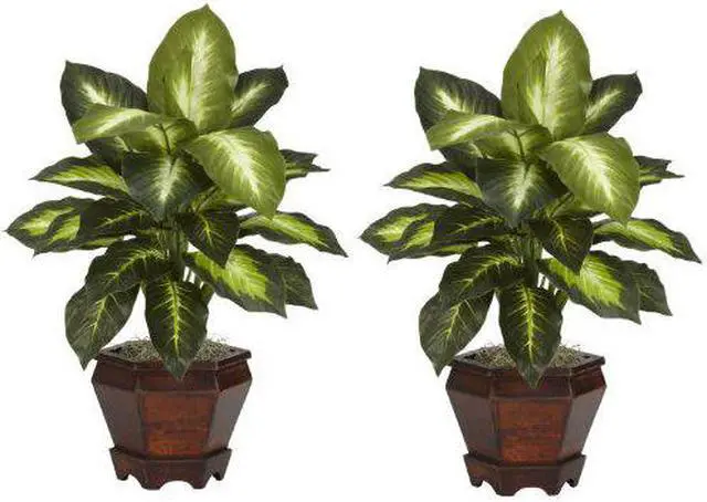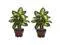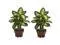 The sharp contrasts of the two-tone leaves will definitely draw the appreciative plant lovers eye from anywhere in a room. The bold leaves that make up these silk plants are "large and in charge" and are coupled with an equally impressive planter. Easy to take care of and effortless to manage, this is one set of plants that youll want to add to your collection. Arrives with two pieces.