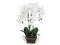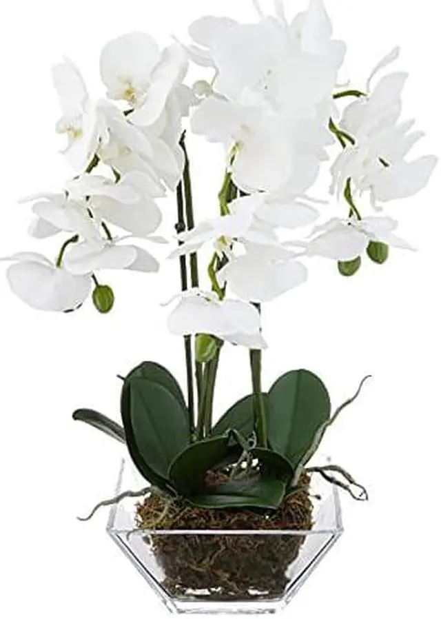 Unique in design and contemporary in style, this faux Phalaenopsis orchid features three cascading stems. Delicate and white, blossoming petals extend atop a clear, glass vase for the perfect tabletop centerpiece. Standing just under 2 ft. Tall, the arrangement is constructed with the highest quality artificial material for a realistic appearance.