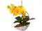 The realistic brilliant blooms of this orchids artificial arrangement arch gracefully up and over glossy leaves, all settled in a printed decorative vase thats filled with faux green moss. Its elegant look makes it a perfect addition to your interior space. Position it on top of your sofa table or mantel and accent it with pillar candles for a charming setup.
