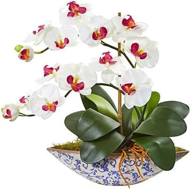 The realistic brilliant blooms of this phalaenopsis orchid artificial arrangement arch gracefully up and over glossy leaves, all settled in a printed decorative vase thats filled with faux green moss. Its elegant look makes it a perfect addition to your interior space. Position it on top of your sofa table or mantel and accent it with pillar candles for a charming setup.