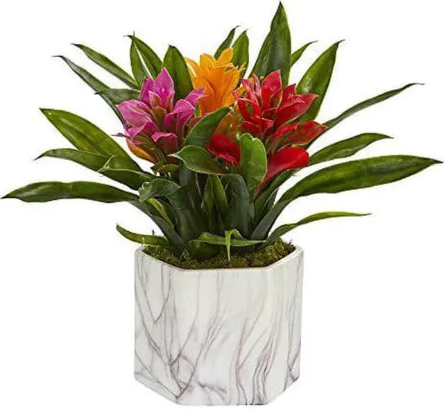 Bright colors can often rejuvenate an otherwise dull room. With passionate bright blooms that accent and sit nestled within its Green foliage, the artificial bromeliad plant that comes in a marble vase will do just that: stimulate and add energy to your living space. Use this brilliant ornament as a centerpiece on your formal dining room table. You can surround it with other marble vases, silverware, and red napkins for a complete look.