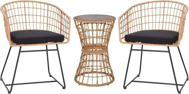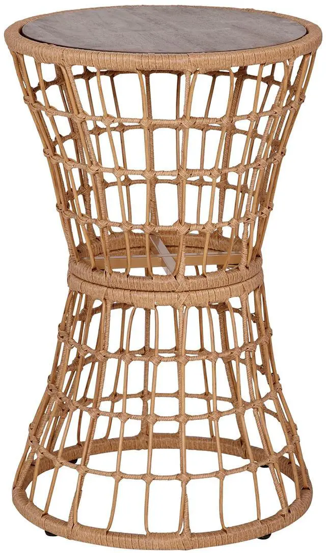 Accessorize your indoor and outdoor decor and gain some much needed horizontal real estate with this boho rattan rope side table. The hourglass shape is pleasing to the eye and the round frame softens straight lines and gives a balanced, geometric look to any space. Place your drinks, snacks, or the latest thriller on the smooth, acacia wood top to free up your hands. Weather and fade resistant, the powder coated steel frame, wrapped in polyethylene rattan wicker, makes this accent table ideal for indoor and outdoor use and accommodates up to 200 lbs.