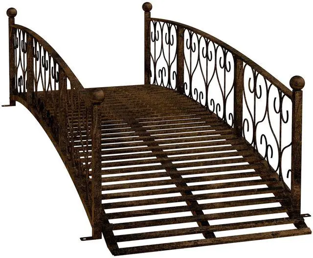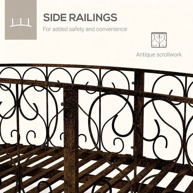 Metal Garden Bridge: This backyard bridge can be placed over a small stream, creek, fish pond, or walkway in your garden for functional outdoor decor. Antique Style: It's an elegantly arched yard bridge that pulls together the landscape of your garden, featuring a frame with scrollwork "S" motifs. It instantly adds antique renaissance charm to any walkway. Safe Handrails: The stylized handrails aren't just for looks