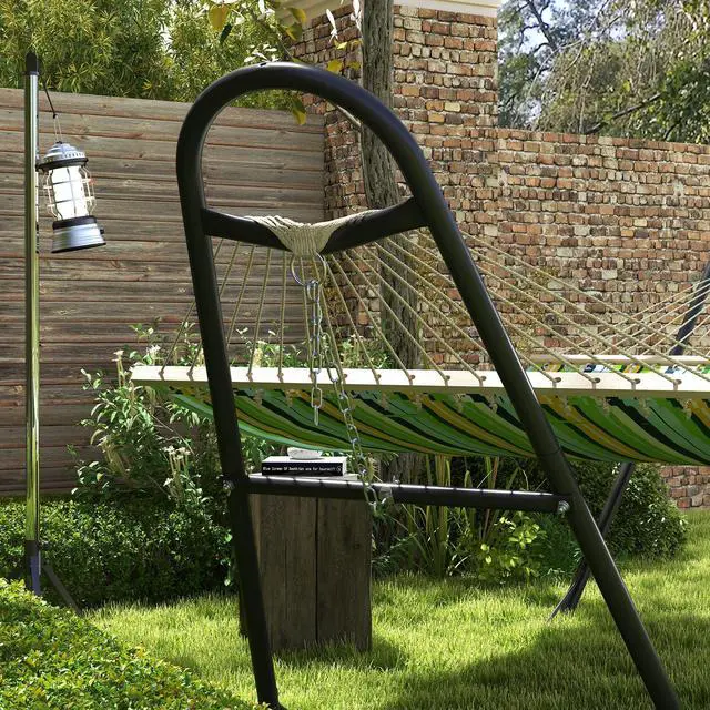 Indoor Outdoor Hammock Stand: Made from strong steel with a powder-coated finish, this heavy-duty hammock stand is built to withstand outdoor conditions while still allowing a 550 lbs. weight capacity.